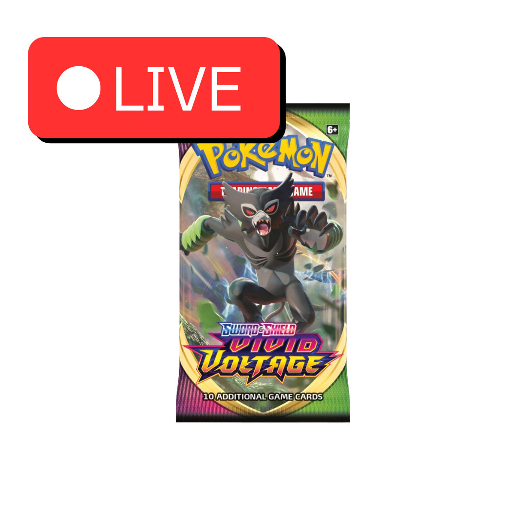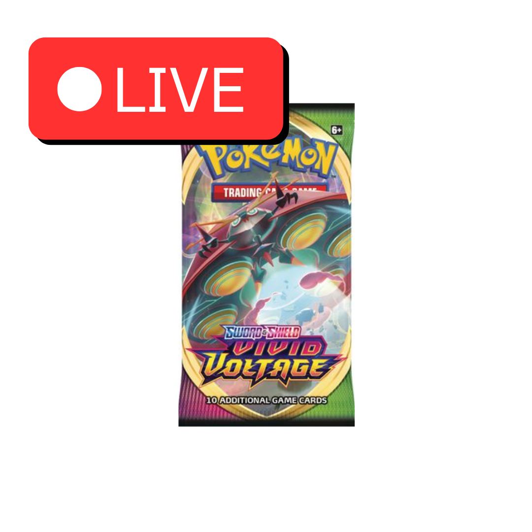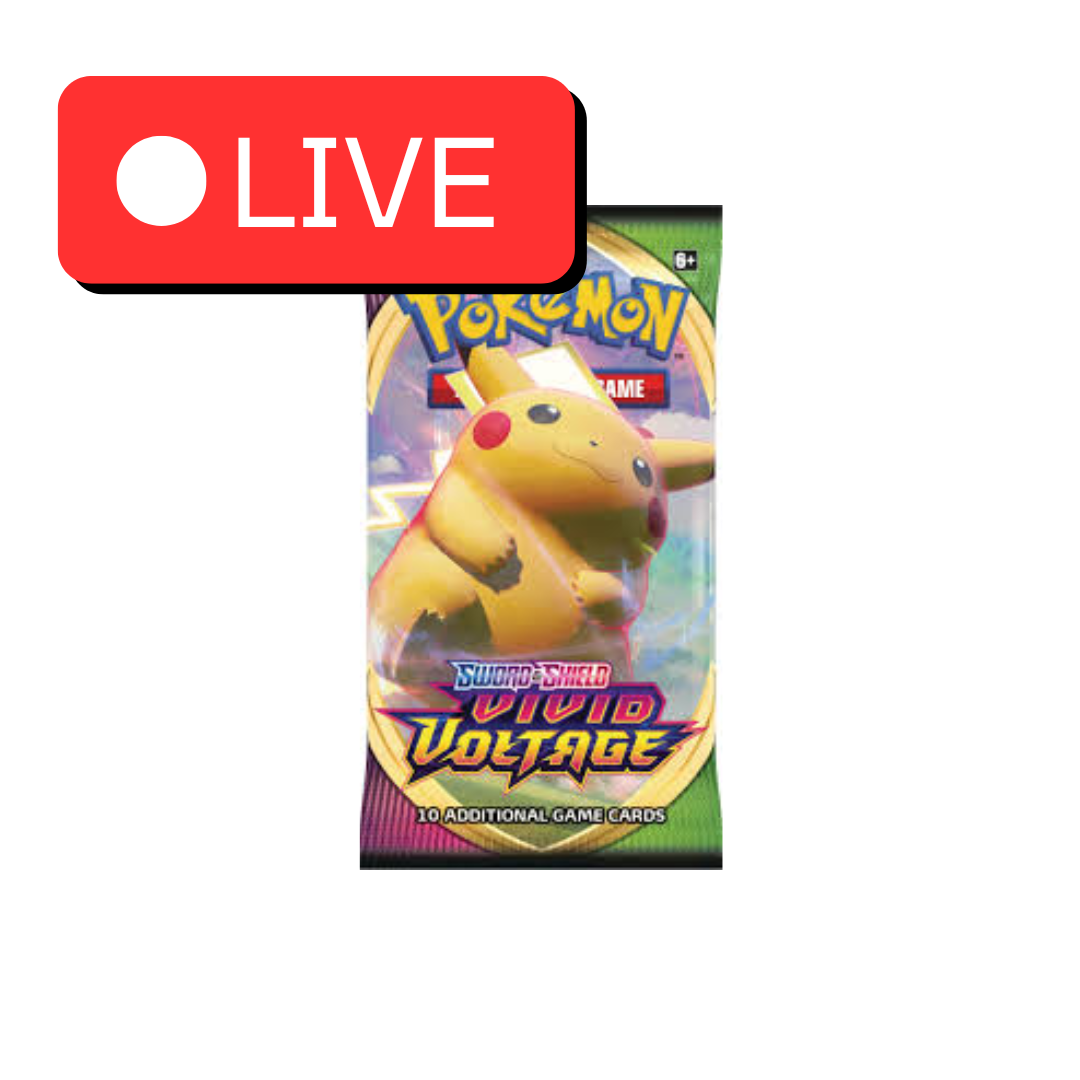Pokémon TCG Vivid Voltage -boosteripakkaus (englanninkielinen). Sisältää 10 korttia, 1 perusenergian ja koodikortin Pokémon TCG Live -peliin. Tunnettu Pikachu VMAX ”Rainbow Rare” -kortistaan.